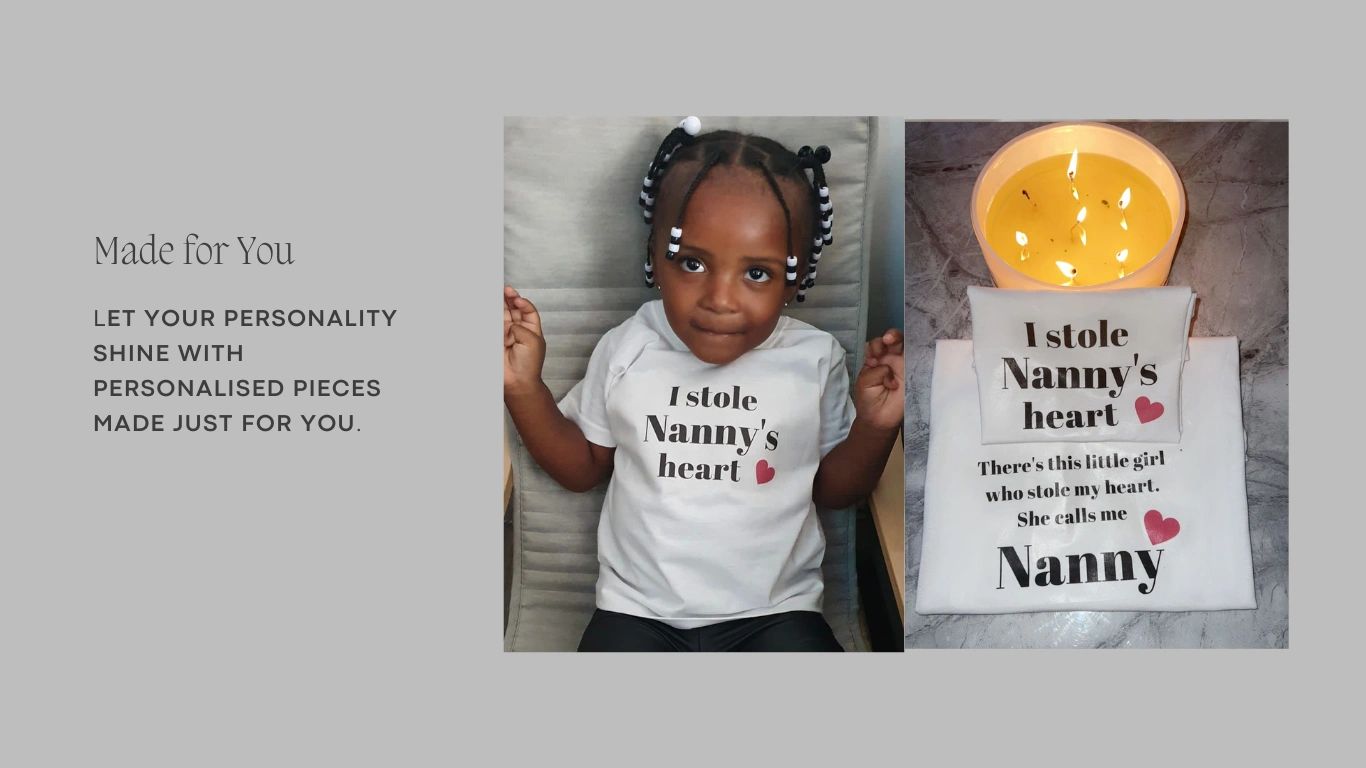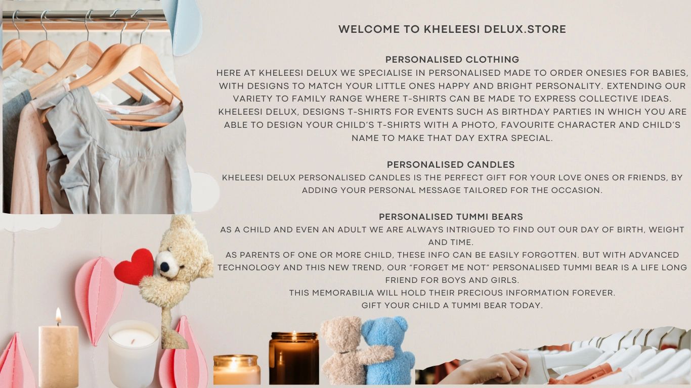 Putting a smile on your loved one's face is our goal. With Kheleesi DeLux Personalised Store we make getting dressed and designing your own candle fun and exciting. We know that a good outfit or a personalised message can make the whole day better.